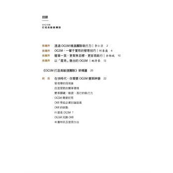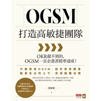 或許你正在苦思,不知如何引導團隊參與變革;或許你正煩惱實踐願景目標與工作計畫太過於空泛,《OGSM打造高敏捷團隊》絕對是可以引導你一步步實踐行動計畫,成就願景目標的最佳實用寶典。 ──余維斌(宜特科技公司董事長)