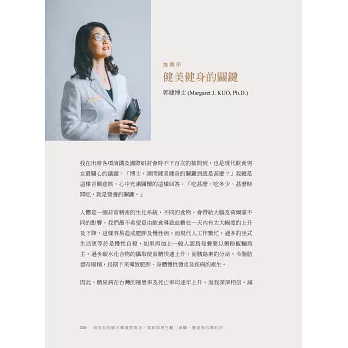 這本新書是華文界第一本完整介紹「碳水循環」飲食法,我十分支持這樣有效的飲食法,它可提供身體增加蛋白質合成和促進脂肪氧化,在國際健美健身界行之有年,也已有更多的科學實驗順利進行中。而在我所認識的多位國際頂尖健身選手的親身體驗中,也確實看到效果。──郭婕博士
