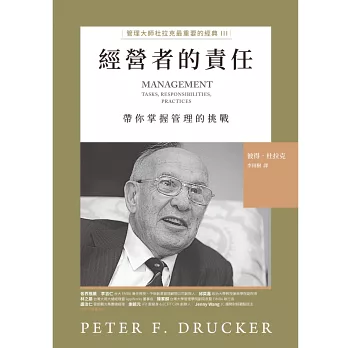 《Management:Tasks, Responsibilities, Practices》是杜拉克的第一套管理著作,也是史上第一套探討管理的專著,讓管理變成可以有系統學習的學科,更可以成功執行。這本專著1973年問世後,啟動了全球管理風潮,成為管理科系與企業經營者最好的入門工具,是杜拉克近四十本著作中,最重要的一部,堪稱「全世界閱讀率最高的管理書」。歷經了半世紀,儘管我們可以找出本書缺少了哪些後來新出現的管理課題,卻很難發掘出已經不適用的部分。