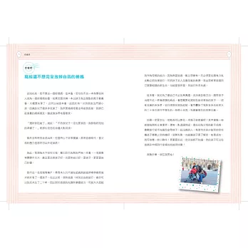 同為單身就愛旅行的媽咪,看完彧馨這本書特別有感。她不僅提到親子旅遊,也同時鼓勵每位母親,可以努力創造出跟孩子旅遊的樂趣,並跟著孩子在旅途中成長。孩子生命的豐盛,往往來自於母親的勇於嘗試,真心推薦此書。──Una
