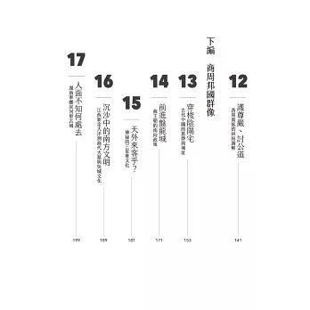 繞了這麼個大圈,我不外想提醒本書的讀者在開卷之前先閉目冥思本書要講的「商周」這個時代,你自小到大從不同管道,閱讀的或聽聞的,獲知什麼樣的「歷史」,或說你腦中會浮現什麼樣的「歷史圖像」,再來檢測自己讀過本書以後,你的「商周圖像」產生什麼變化?有沒有增添新內容?會不會扭轉舊意象?