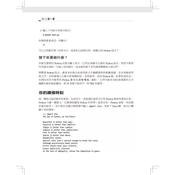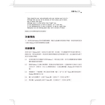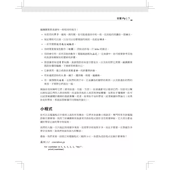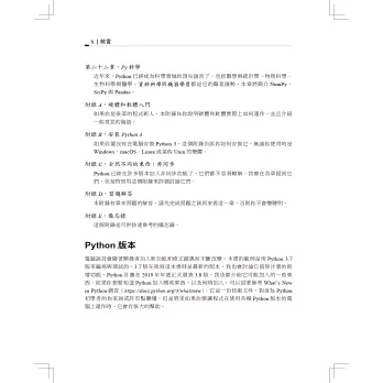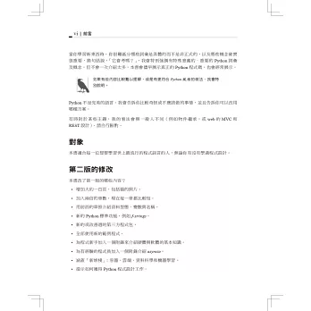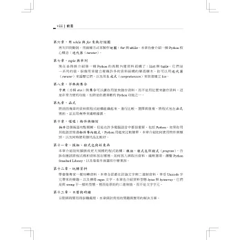 讀完本書,你將紮下深厚的Python基礎,包括測試、除錯、重複使用程式碼的最佳做法以及其他開發技巧。這個版本除了加入新的範例程式和習題之外,也會教你如何使用Python撰寫商業、藝術、科學應用程式,以及運用Python工具和開放原始碼套件。