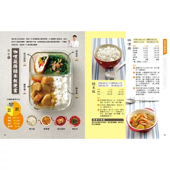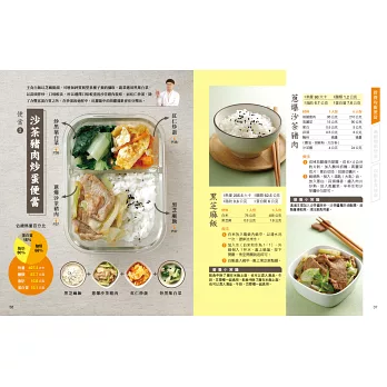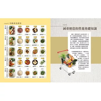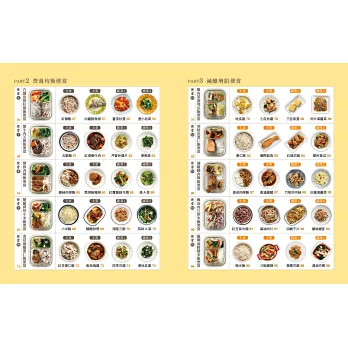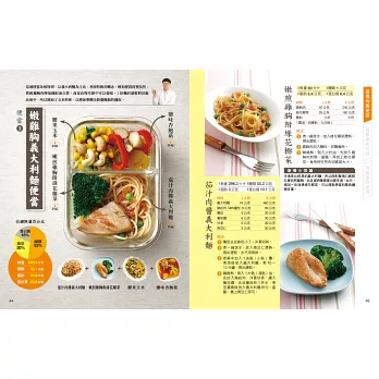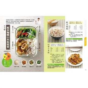 本書最吸睛的就是20組便當,以及素人也能輕鬆學的「菜單設計大解密」。不需額外花錢請營養師設計,營養師杯蓋已經按照三大主題,特別製作了500大卡便當。主食除了五穀飯、糙米飯,更推出義大利麵、肉燥飯和翡翠炒飯等;主菜則有黑胡椒豬排、麻油雞、白醬鮮魚排、滷雞腿和海陸三鮮等,中式、異國風味統統有,這麼不像減重的減重便當,別說減重族必吃,一般懶得思考每天便當菜色的人,也能一同嘗試!
