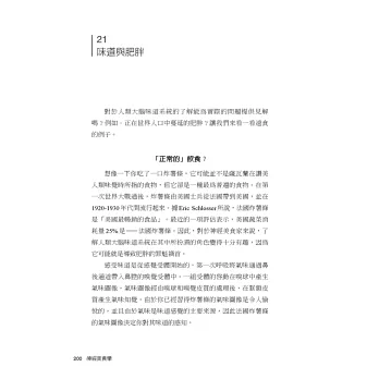 在這一新領域中,我一直在研究大腦如何形成氣味圖像。這些研究結果及來自世界各地實驗室的其他研究,正在徹底改變我們過往對嗅覺感受的普遍看法。過往,我們曾一直認為嗅覺是日常生活中,功能最弱的感官感受;現在,因為它對味道的角色,已躍升成為最為重要的感官之一。這延伸產出一個新的概念--獨特的人類大腦味道系統。它或許是大腦分布最為廣泛的行為系統,包括產生知覺、情緒、記憶、意識、語言、決策等,都以味道為中心。透過結合腦與飲食的研究,加上每一次與家人用餐時,互相交流味道感受的知識。神經美食學有望為健康飲食提供新的科學基礎。本書中,我將透過許多研究解釋這一新的領域,並展現它對於大眾的優點。