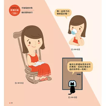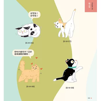 本書以「手繪風」為主要插畫風格,以黑白貓「阿立」角色為中心,並以「阿立的冒險」為主題,創作出「阿立」冒險的6個場景「家裡」、「社區」、「商店街」、「田野間」、「貓之島」,帶出相關的人物與物品。6個章節不僅主題明確、風格一致連貫、插圖實用性高,也充滿了趣味性!