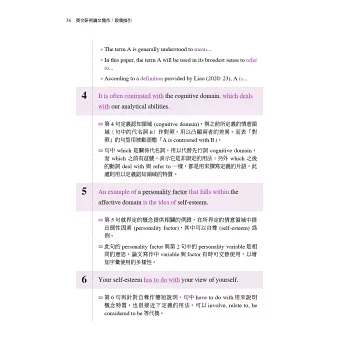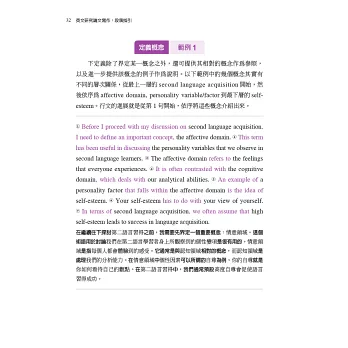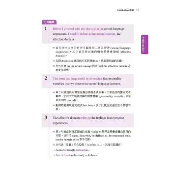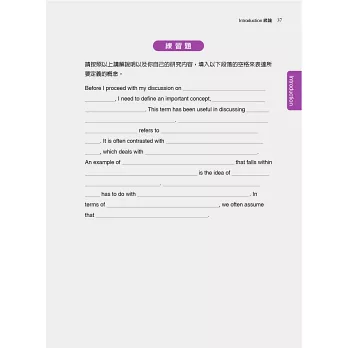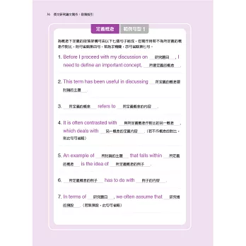 本書另一特色是在句型及詞彙的練習上以詞彙群的概念來安排講解,符合當代認知語言學派所強調的學習理念,即在一定的認知框架下以語意群組的方式學習,無論是對文本的理解或者產出均較有助益。全書即遵循這樣的模式安排,將論文篇章的結構性區塊詳細分析講解後,讓讀者填入個別學術領域的內容,反覆在整體論文架構及章節細節之間來回練習反芻以求熟練。誠言,「像不像三分樣」,只要按著本書的安排循序漸進反覆練習,必能舉一反三,熟稔論文寫作的技巧,並能將想法清楚表達,寫好一篇英文研究論文。