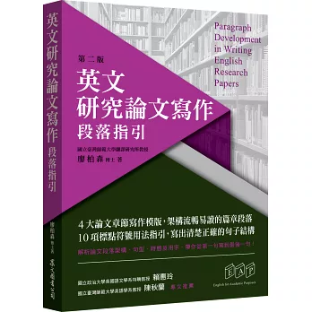 很高興看到廖柏森老師的新書《英文研究論文寫作:段落指引》的出版。這本書整合廖老師前三本英文研究論文寫作系列:《英文研究論文寫作:關鍵句指引》、《英文研究論文寫作:搭配詞指引》及《英文研究論文寫作:文法指引》,整個系列提供研究生在論文寫作時從摘要、緒論、研究方法、研究結果、討論,乃至於致謝詞等不同章節之寫作範例及練習。此書更以段落為單位,深入探討論文各部分的結構、用字遣詞,及可替換之不同語詞,讓初次嘗試寫研究論文的學生能由模仿習作漸漸掌握研究論文寫作的訣竅。