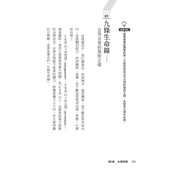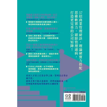 1. 作者具豐富商管學習資歷及商業界深厚的實戰經驗,每一章節扼要說明管理理論,再補充強力企業實例。