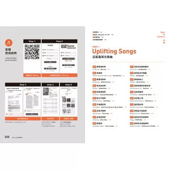 這本書到底是怎樣的一本書呢?一言以敝之,就是結合「正能量」與「學英文」的一本書,分為「正能量英文歌單」和「正能量英文文章」兩個部分。開頭先介紹二十首JR我很喜歡的英文流行歌,從邦喬飛、艾薇兒到紅髮艾德、共和世代,每一首歌都是針對某個「症狀」,像孤單、沒人理解、失去親人等特別對症下藥、精挑細選的。我除了會把歌曲的故事細細述說給你聽,還會教你歌詞裡簡單好用的口語片語,裡面的例句對話還是我親自錄音的,很讚吧!(都自己在說!)