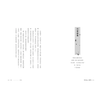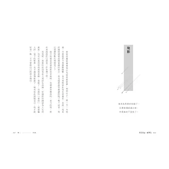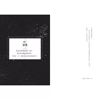 這本書從「碎裂」到「擁抱」,最初是以為他會回來的仰望,過盡千帆皆不是的傻愣,因為對方在心裡仍舊占了一席之地,縱然他已經遠走,卻還是這樣霸占了所有情感。我的接受與不接受,都不能控制,只能任由他在腦海裡讓我一次一次疼痛著。疼痛以後嘗試著拼湊,是無助卻又得站起的艱難,在人前不肯掉一滴眼淚,也不願吐任何一個關於過去的字,只是靜靜地在空蕩的房裡嘗試把自己拼回原本的模樣,重新相信一切都是好的,美好的遲早來到身旁,卻還是難免留下了瘀痕。那是痕跡,象徵我們曾經在一起,代表著兩人身不由己,你的永遠跟我的不朽終究是擦肩而過。可是到了後來,刺蝟般的我,還是想要擁抱自己、擁抱別人,所以我相信黑色也是一種顏色,遲早我不會再只能蟄伏在你的影子裡,可以走出自己的一條大道,快樂地活,瀟灑地笑─真正明白這樣的自己,也很好;而相聚與離開,也本來就相依相偎著。