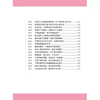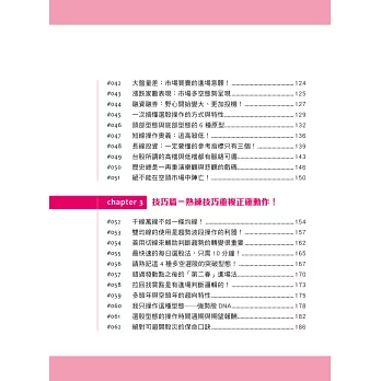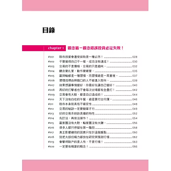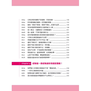 這本書共計有四個部份:觀念篇、基礎篇、技巧篇、經驗篇,目的就是化繁為簡、循序漸進,用十多年的股市交易與豐富教學經驗,歸納出100則交易觀念以及交易技巧,讓讀者與學員們可以快速掌握重點、有效縮短學習的時間,不論股市摸索期的初學者或者調整期的交易者,都能輕鬆上手學會股市操作。
