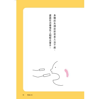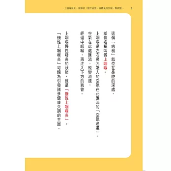 整本書的重點就是在告訴我們,上咽喉部是健康的基石。把基礎弄好,整個健康大樓就固若金湯,不怕風吹雨打太陽曬。我們可以更客觀廣義的說病從口鼻入,有一才有二,才會生三得萬病,用上呼吸道擦抹療法治療慢性上咽喉炎,絕對值得專業人士去執行,多一個利器幫助病人遠離難纏的病痛,病人能夠恢復健康是醫師最驕傲的一刻。包括醫者與讀者,有緣看這一本書必有滿滿的收穫,更有信心面對並解決各種疑難雜症,一起擁抱樂活與健康。