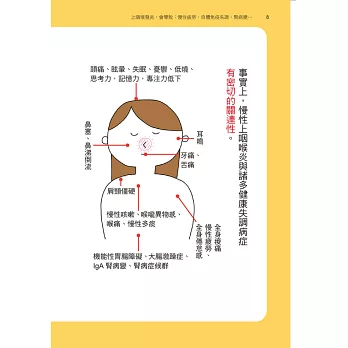 有沒有什麼辦法證明作者的論點是對的,並且可以有效解決病症?本書的重點來了——利用「上咽喉擦抹療法」達到此目標,尤其是在急性上呼吸道感染的時候,可以立即將病毒、細菌清除,以減少菌血症、病毒血症,也就不會發生疲倦、肌肉痠痛、發燒、喉嚨痛的現象,並且迅速恢復健康。對於任何的慢性感染,上咽喉免疫細胞的慢性刺激現象也會減緩,反覆有耐心的治療後,可以減少許多自體免疫失調與慢性疾病症狀,甚至恢復健康(見第三章)。
