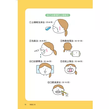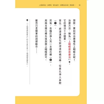 我在台灣的藥典上找不到書中提及的氯化鋅溶液,臨床上我們耳鼻喉科醫師可以利用碘甘油製劑來代替作者建議的氯化鋅溶液。利用細棉支沾上並直接塗抹在鼻咽腔上,也可以稀釋後做鼻咽喉部蒸氣薰蒸或噴霧治療。從我看了這一本書之後,看診時就照著書中的方法刻意學習用我們耳鼻喉科醫師看診常用的碘甘油用細棉枝擦抹出現紅腫的上咽喉部位,並且得到許多正面回響。