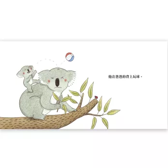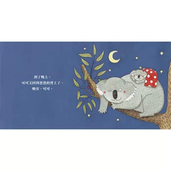 小無尾熊可可最喜歡待在爸爸的背上。他在爸爸的背上吃東西;不小心在爸爸的背上尿尿了;就算去洗澡,他還是黏在爸爸的背上。相當依賴爸爸的可可,看到漫天飛舞的蝴蝶,難得地踏出了探險的第一步……