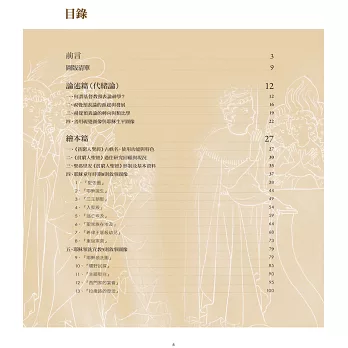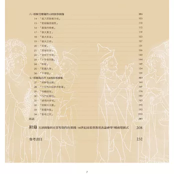 最後需做提及的是,本書內容取自筆者過去就聖弗里安《貧窮人聖經》所撰4篇論文。現經彙整潤飾結集做完整呈現,內容結構沿襲前文,有耶穌童年時期(8則單元)、領洗宣教時期(5則)、受難犧牲時期(13則),與復活升天時期(8則)等4區塊鋪設,收錄於本書第二章繪本篇下。在本書啟首第一章上,則增列4節次的論述篇,綜理有關基督教預表論神學的源起、特質功能、運用範疇、轉向發展、與基督生平視覺圖像等主題擇要內容,說明其梗概原委。以附錄方式,在本書書尾,另收納一篇有關視覺預表論概論性文章,先前也曾發表,將基督教視覺藝術自早期至文藝復興盛期發展做一扼要梳爬,以提供跨時代史觀輪廓,相信有所助益。