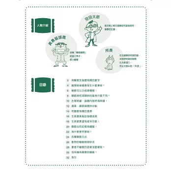 《健康研究室 營養篇》中,我們一起跟著故事中的太郎潛進高科技電腦「身體地圖」中,就會發現其實吃飯、進食,是為了攝取食物中的「營養素」。而營養素可以分為五大類,分別是醣類、蛋白質、脂質、維生素(維他命)、無機鹽類(礦物質),有時候還會再加上第六大類,膳食纖維。