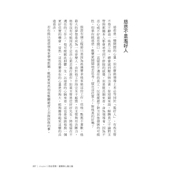 此書的作者陳德中老師,以己身逾二十年的正念修行基礎,加上心理師背景的訓練以及多年現代正念的教學經驗,提供了這本由內而外的領導力書籍,不僅包含了現代正念的核心訓練,也提供了許多職場上可應用的方法與技巧。書中漸次地引導大家找到自己心中的價值、天命與願景,以提供企業及個人源源不絕的前進動力。最後以慈悲領導作為此書的最後一個章節,而慈悲心也是每個人內心最深的渴望與本質。