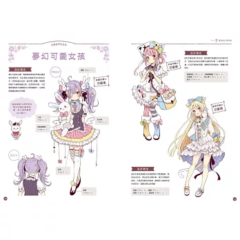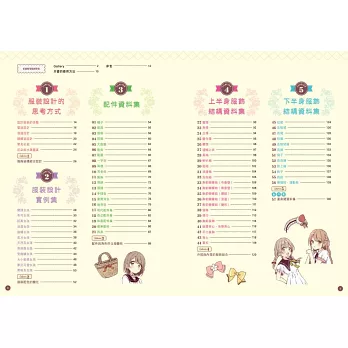 本書的主題為「可愛服裝設計創意集」,因此刊載了許多可愛系服裝與配件等服飾的各種變化。