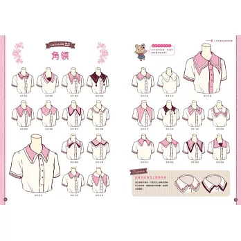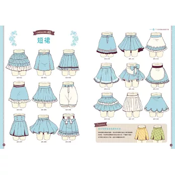 內容按衣領、裙子等各服裝結構,分門別類統整設計創意,自由組合便能設計出成千上萬套服裝。