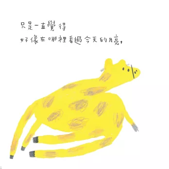 長頸鹿覺得好像在哪裡看過今天的月亮,他一直想、一直想,卻怎麼也想不起來。不行,不行,他想得腦袋開始發燙!到底今天的月亮像什麼呢?