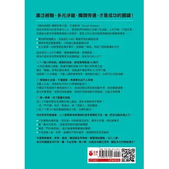 「我們已經相信單一成功之道太久了,認為要盡早起步,追求專精,著重效率。然而在這本石破天驚的大作裡,艾波斯坦指出大多數領域的成功之道其實截然不同,反而是廣泛涉獵,四處經歷,多繞遠路,多方嘗試。這本書至關重要,無比切時,無論主管、家長、教練或想提升表現的人都該好好一讀。」──丹尼爾‧品克(Daniel H. Pink),《動機,單純的力量》(Drive)、《什麼時候是好時候》(When)作者