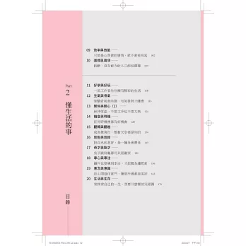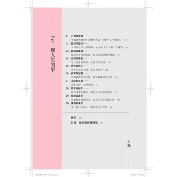 回顧職涯,她發現成功的人、工作快樂的人並不是天生有多麼獨特,而是他們都特別「懂事」:懂領導的事、懂專業的事、懂關係的事、懂人才的事、懂情緒的事、懂失敗的事、懂成長的事……因為懂事,所以面對解決問題時,姿態更加從容輕盈,也能慢慢依著自己的想望和興趣成就美好生活。