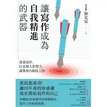 我自己深深受惠於寫作所帶來的許多機會,因此非常清楚寫作不但是最好的自我投資,寫作更是自我精進的武器,如果你也很清楚寫作能對你帶來的改變,我衷心推薦你閱讀師北宸老師的這本好書,如果你還不清楚為什麼寫作很重要,那麼師北宸老師的個人經歷以及書中所列舉的許多案例,將可以清楚讓你了解,為什麼在現代快速變化的職場中,寫作愈來愈重要。——INSIDE主編、Hahow 《職場寫作課》講師 李柏鋒