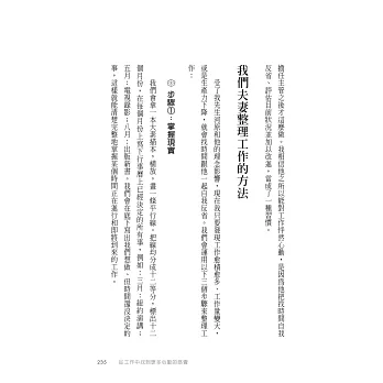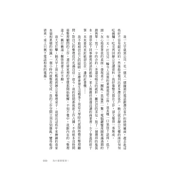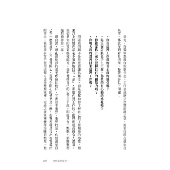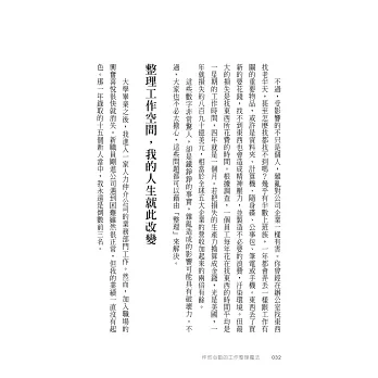•這本書不只可以運用在工作上,也能幫助你整理社群媒體、儲存在電腦裡的資料、手機APP等。比起實體的雜亂,這本書更著重於整理內在的雜亂。