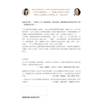 在本書中,麻理惠和萊斯大學商學院教授、《讓「少」變成「巧」》作者史考特‧索南辛,進入你生活的第二個重心區──「職場」,結合真實案例、研究發現和實用技巧,從整理抽屜、桌面、實體辦公空間,到整理你的email信箱、會議、時間、人脈、決策……一步一步帶領你整理工作空間,拿回人生的主控權。