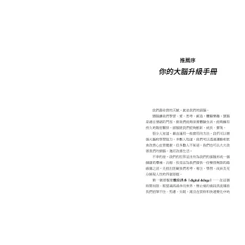 「任何重大改變都需要心智工具箱,幫助擴增創造力、快速學習、宏觀思維及樂觀進取。想要拓展智力潛能、超越可能極限的人,都應該閱讀這本書。」――彼得・迪亞曼迪斯(Peter H. Diamandis),X獎基金會(XPRIZE Foundation)創辦人暨董事長、奇點大學共同創辦人