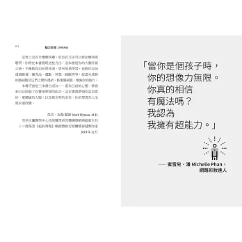 「這世上沒有什麼聰明藥,但吉姆・快克提供的方法,能夠幫助釋放你的最佳腦力,為你開啟最光明的未來。」――馬克・海曼醫師(Mark Hyman, M.D.),克利夫蘭醫學中心功能醫學研究機構策略與創新主任、美國前總統柯林頓夫婦醫療顧問