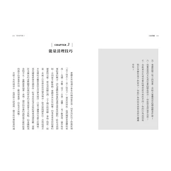 最重要的部分會是你的個人清理,這將在第二部分中介紹。個人清理包括創造一個技巧工具包,讓你根據需求,在不同的情況下使用這些技巧來清除自己內在長期存在的能量障礙,並發展出能夠維持能量的方法。你可以嘗試我所介紹的技巧,並在日誌中記錄練習的情況,以及量身打造出更適合你自己的方法。為自己嘗試了一些技巧之後,我會幫助你一步步地開發出對你和目前生活都有效的練習。你不需要完全改變你的生活,也不需要購買任何特殊物品。這些想法會潛移默化成為生活中的一部分,就像洗臉或穿鞋一樣自然。