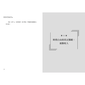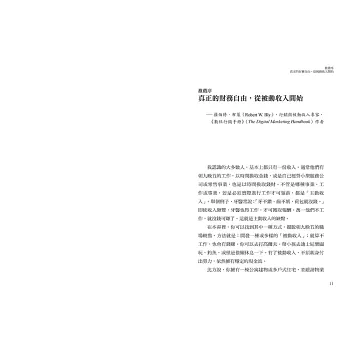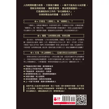在本書裡,你可以找到其中一種方式,擺脫朝九晚五的職場較勁。方法就是:開發一種或多樣的「被動收入流」;就算不工作,也會有錢賺。你可以去打高爾夫、帶小孩去迪士尼樂園玩、釣魚,或僅是偷懶休息一下。有了被動收入,不須親身付出勞力,依然擁有穩定的現金流。