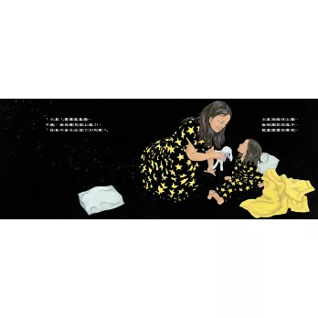 故事中母女間甜蜜的互動溫暖我心,人物表情刻畫細膩,全黑的背景更凸顯夜的黑與月的美,她們身上那套童趣的星星親子睡衣,似乎透露著親情間的愛像星星的微光一般,在星空中低調的閃亮著。