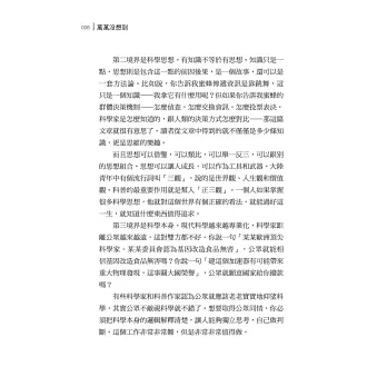 第二境界是科學思想。有知識不等於有思想。知識只是一點,思想則是包含這一點的前因後果,是一個故事,還可以是一套方法論。比如說,你告訴我蜜蜂傳遞資訊是靠跳舞,這只是一個知識──我拿它有什麼用呢?但如果你告訴我蜜蜂的群體決策機制──怎麼偵查,怎麼交換資訊,怎麼投票表決,科學家是怎麼知道的,跟人類的決策方式怎麼對比──那這篇文章就很有意思了。讀者從文章中得到的就不僅僅是多少條知識,更是思維的樂趣。