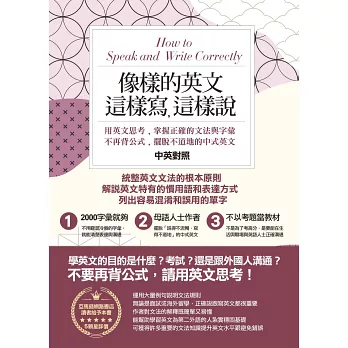 台灣坊間的英文學習書籍喜歡列公式讓學生背,或過度仰賴中文的思考邏輯學英文,但本書以深入淺出的方式解說文法概念幫助讀者理解,也因為是母語人士所寫,自然是以英文為出發點思考,擺脫不道地的中式英文。