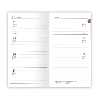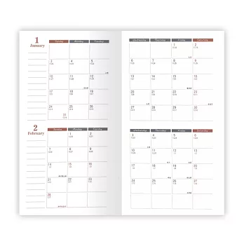 含年、月計畫表、日誌、通訊錄、高速公路與捷運路線圖、農民曆等實用資料。本日誌為左4右3版式,可攤平設計更好書寫,陪您紀錄生活點滴,更是規劃行程的好幫手。