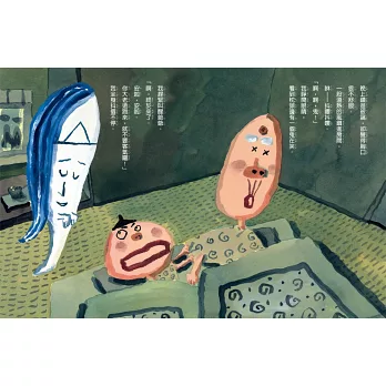 接下來爺爺幫鬼按摩,邀他一起去泡溫泉,還陪他聊天談心。第二天醒來,鬼已經不在了,我問爺爺是不是再也見不到鬼了,爺爺說:「安啦,安啦。你還想見他嗎?」我好像想見,又好像不想再見,那感覺真是奇怪!結果回到家,打開廁所的門,居然有個「訪客」坐在裡面,那會是誰呢?