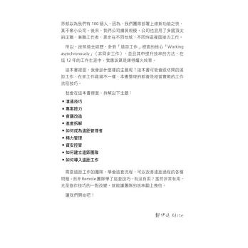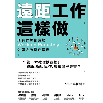 1. 《Growth Hack這樣做》、《閃電式開發》、《打造超人大腦》作者Xdite最新著作,本身實踐遠距工作方法多年,本書為其帶領國內外多個遠距工作團隊的經驗總結。