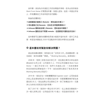 這本書不會只談遠距工作的工具或方法論,這本書也不是嚮往在家工作的心靈雞湯。