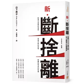 本書便是山下英子老師融會《斷捨離》、《俯瞰力》、《自在力》三大代表作的精華,教你如何按部就班地實踐「斷捨離」,堪稱「斷捨離」系列的集大成之作!書中並提供了五個物品取捨步驟和五大日常收納法則,幫助你能夠更快上手。當你持續生活的正向循環,你就會感到心靈變得越來越輕盈,而你的人生也將產生巨大的改變。今天開始,就一起來感受「斷捨離」的神奇力量吧!