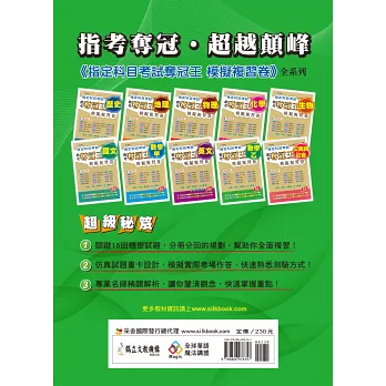 收錄100-109年大學指定科目考試歷屆試題,且由補教權威名師做最完整的試題分析暨精解,並含一回最新年度的模擬試題與解析,最新收錄「考前10分鐘攻略」。不同於坊間一般的簡解,本書詳實的解析補強考生對觀念的理解,讓同學強化思考脈絡,啟發作答技巧,適合於最後衝刺階段時加強演練,在最短時間內快速掌握考試重點及命題趨勢,是最實用的考前寶典!