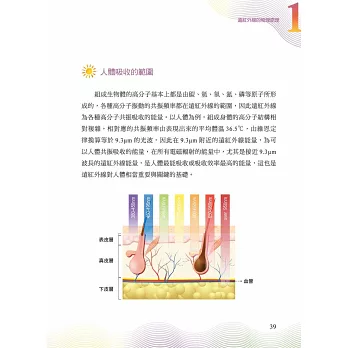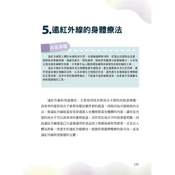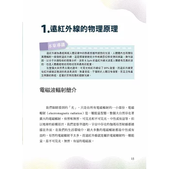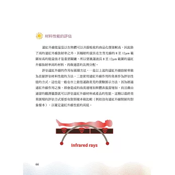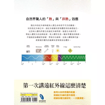 遠紅外線不僅會被人體吸收,人體亦可發出遠紅外線。本書藉由文獻研究數據資料、圖示說明,遠紅外線可視為一種「輔助或改善」病徵和維持健康的工具,可以促使組織細胞共振吸收能量,產生抗氧化抗發炎、改善心血管功能、改善肌肉痠痛、促進循環、疼痛緩解、活化細胞、促進代謝、水分子活化等功效。