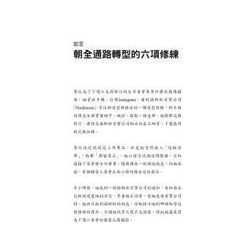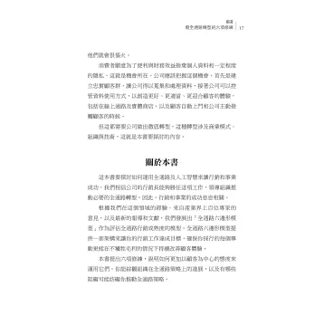 針對全通路行銷最重要面向,本書有完整而精闢的指南,書中提供全面、有條不紊的方法,既可讓剛跨足數位及電子商務領域者參考,又可作為資深行銷人員實用的教科書。-安利奎.維瓦斯.蓋維諾(Enrique Vivas Gaviño)沃達豐集團(Vodafone)商務長