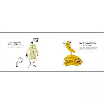 圖畫很有趣且引人好奇,例如當老師說他準備「洗耳恭聽」的時候,圖畫中的老師就有一對大耳朵。還有,貓狗為什麼會從天上掉下來?老師的身體會變成起司?小男孩坐在蚌殼上看書?還有香蕉一臉神氣的樣子…解答都在圖畫裡!當故事中提到某個人是大人物時,那人的身體就變成了『起司』,原來,在英文俚語中『Big Cheese』指的就是老大!猜猜看,『top banana』竟然是用來形容人,又是什麼意思呢?