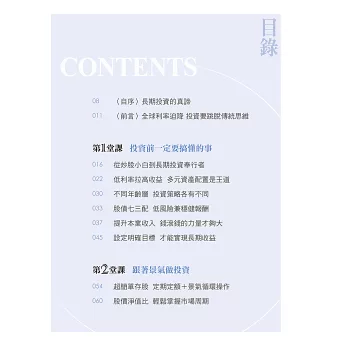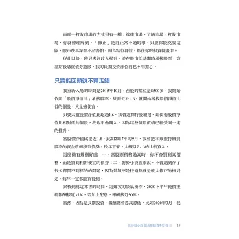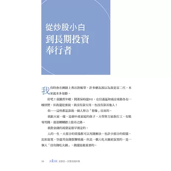 這本書,就是對長期投資重新省思,除了更穩健的角度篩選股票,也加入債券避險哲學,提升到景氣投資層次,希望讀者能夠用更長遠的角度,思考長期投資的真諦。