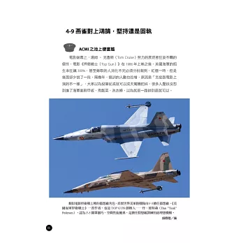 空軍的飛行員有個毛病,就是講到飛行的時候口沫橫飛,但只要拿起筆來就頭歪眼斜,筆桿比駕駛桿還重,一聽到寫文章就卻步,有不少讓大眾多了解空軍的機會就這樣錯過了,相當可惜;當我知道作者要推出這本書的時候,我個人相當興奮,幾位作者以親身經歷,寫出了戰鬥機飛行員培養與成長過程,以及新一代機換裝的第一手資訊,空軍需要大家的支持與愛護,書裡面談到很多的事情,揭開了戰鬥機飛行員神秘的面紗,也讓喜愛航空的人能夠對航空有更進一步的了解,以往抬著頭那種遙不可及的感受,現在都可以藉由這群飛行員親身說明,讓一些愛空軍以及關心空軍的大眾,除了看看基地開放與航展之外,還能夠進一步增加對空軍的了解,我個人早就期待類似這樣的書籍問世了。