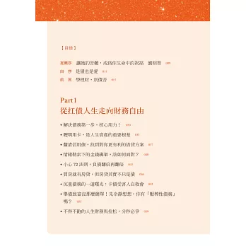 無論對誰而言,理財理債都是需要自己長期抗戰、努力精進的功課,感謝出版社給我機會完成這本理債理財心法兼工具書,將我的個人經驗整理出簡單脈絡,結合我學習過的理論,透過個案分享的方式,協助大家找出財務盲點;書中也提供了理財理債的觀念看法,與你分享我如何看待人生下一階段的退休金準備與身後事規劃,不畏風雨地逐步架構,走過負債之後的新人生。
