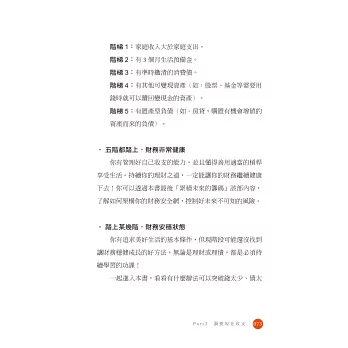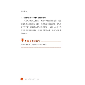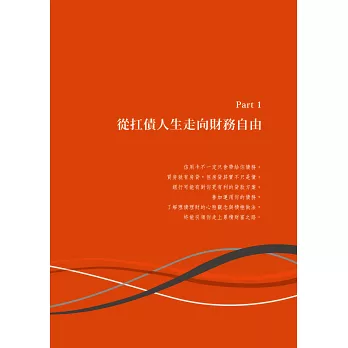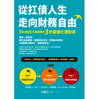 這本書就是要帶領你,從如何檢視現在的收支開始,解決過去積欠的債務,到逐步累積未來的籌碼,步上財務正循環。